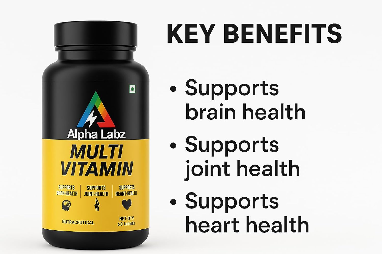 - Supports Brain, Heart & Joint Wellness : Key nutrients such as Vitamin B-Complex, Vitamin E, Magnesium, Zinc, Lutein & Chromium help maintain cognitive performance, cardiovascular well-being, and joint mobility. The packaging highlights benefits for Brain Health, Joint Health, and Heart Health.