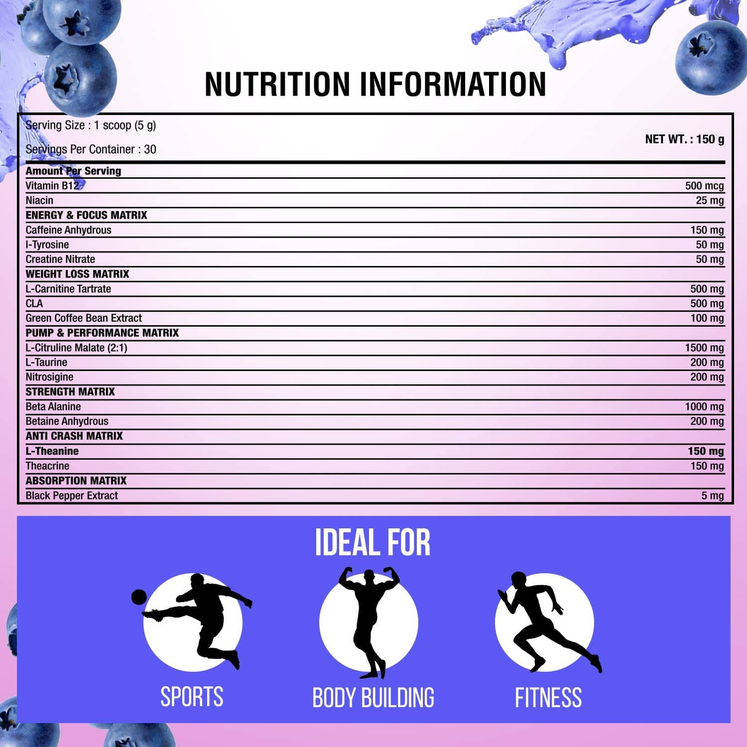 • Shredz Pre is a complex formulation designed with 6 Core Matrix [Anti Crash Matrix, Weight Loss Matrix, Strength Matrix, Energy & Focus Matrix, Pump & Performance Matrix, Absorption Matrix]