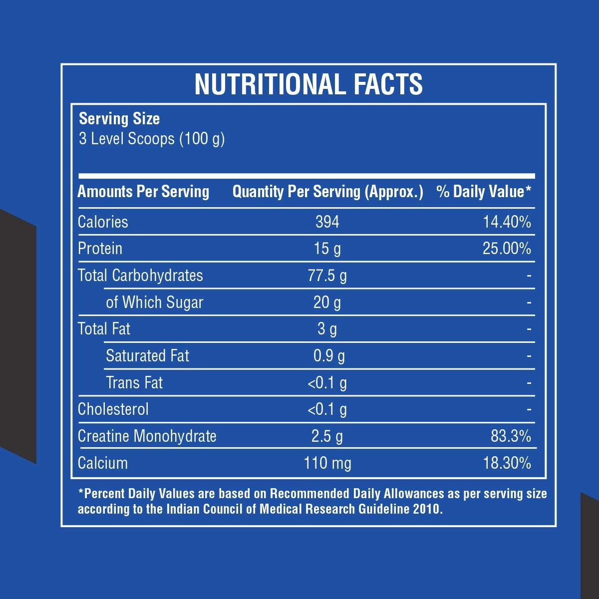 - It has a perfect blend of proteins, creatine monohydrate,malt dextrin, starch and skimmed milk powder to support your overall growth