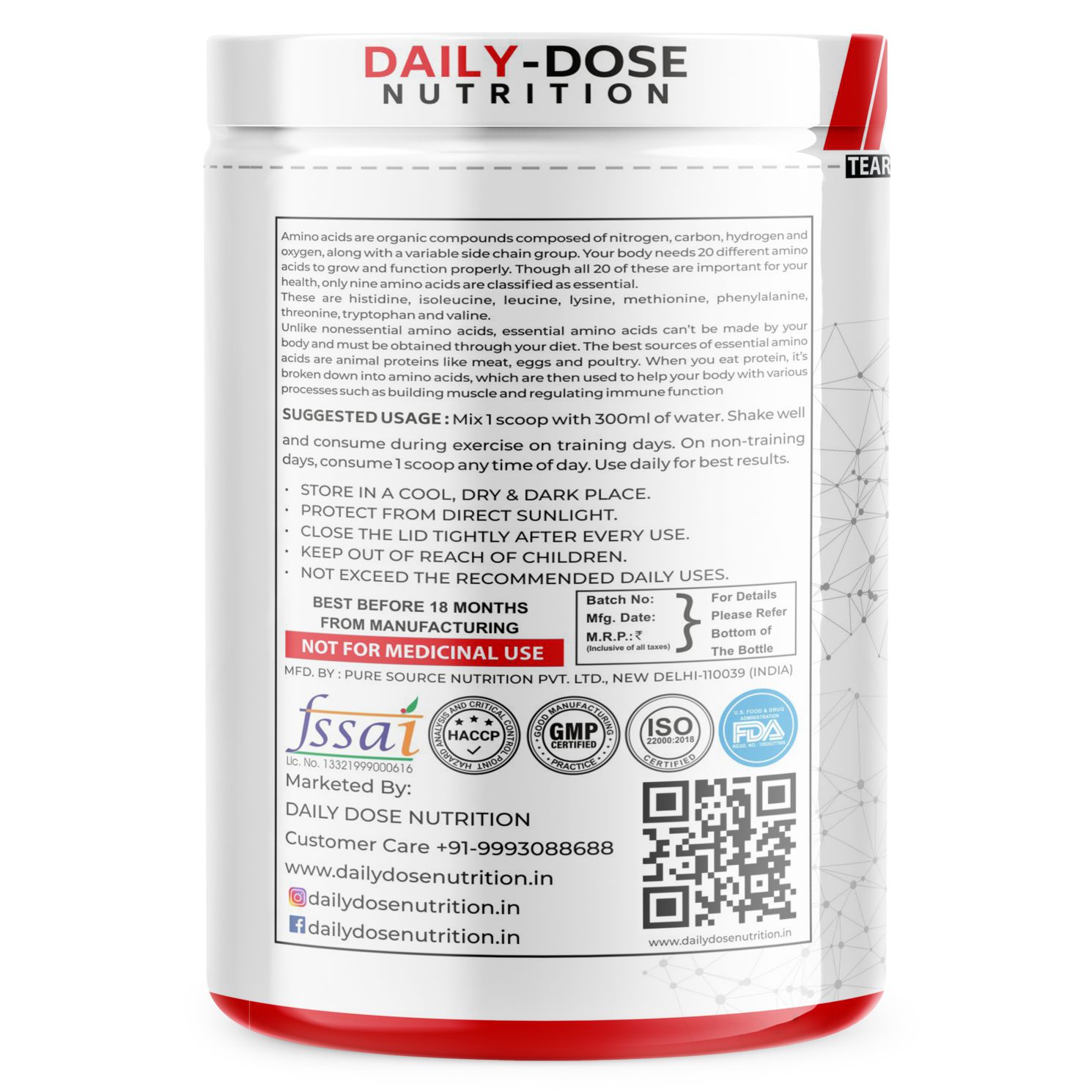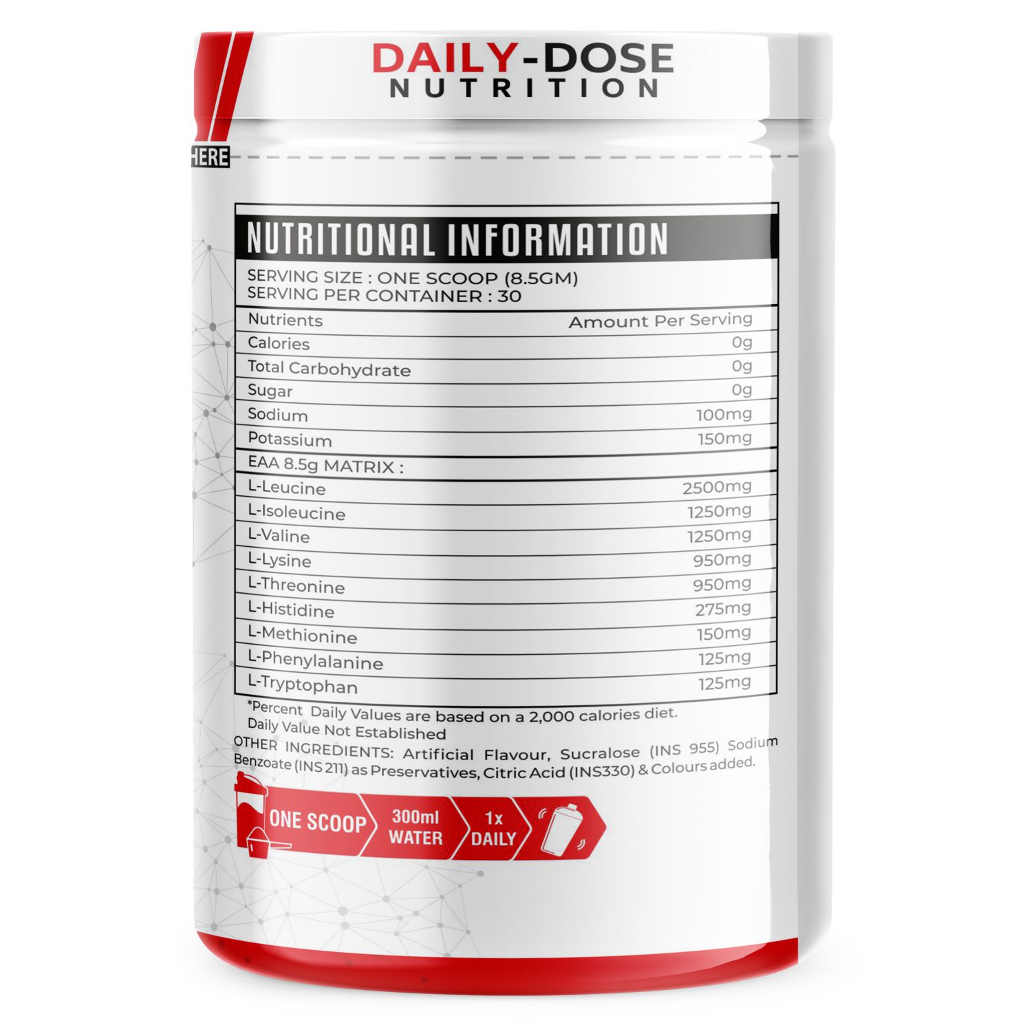 Daily Dose Nutrition eaa is a mix of all nine essential amino acids, including three branched-chain amino acids (l-leucine, l-isoleucine and l-valine) with zero of calories and sugar. What is an eaa. Eaa stands for essential amino acids. Eaa are amino acids that cannot be synthesized by the body and need to be consumed in the diet. Eaa supplements have a number of performance and health benefits Daily Dose Nutrition EAA will be a much more convenient way to provide your body with essential amino acids. 2.5G of l-leucine increases protein synthesis, boosts stamina and endurance and improves muscle recovery.