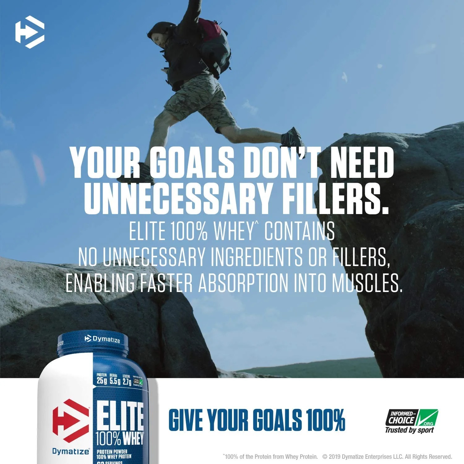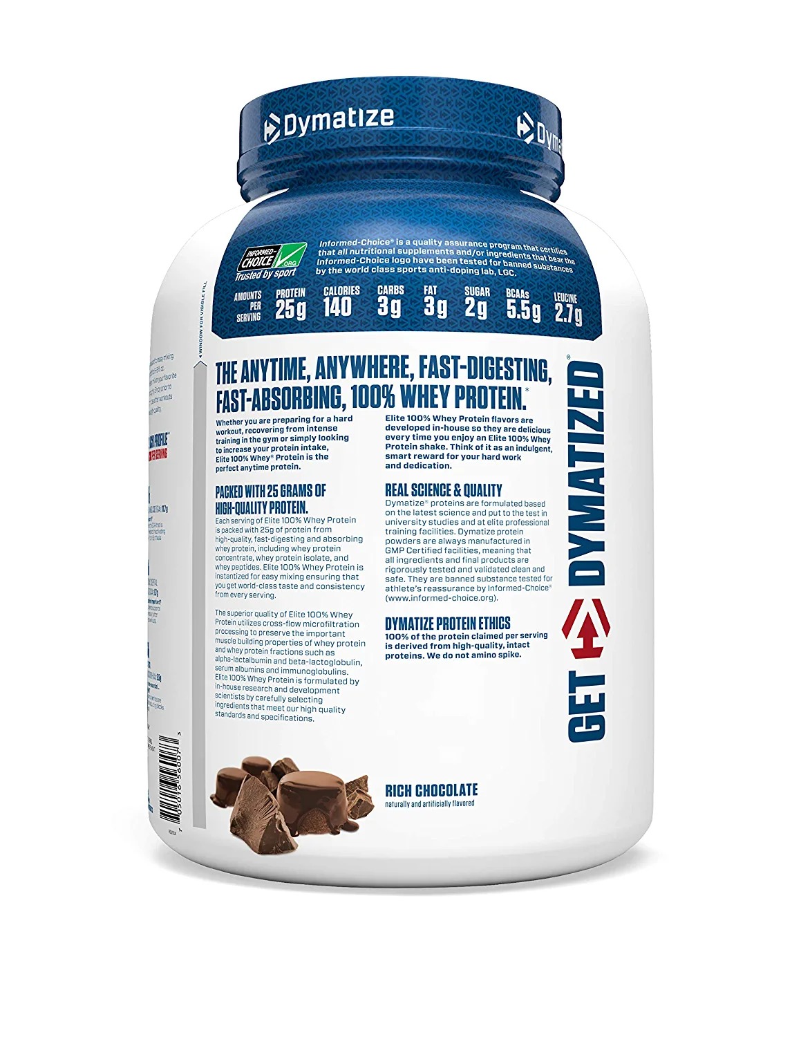 Protein: 25 grams. BCAAs: 5.5g. Glutamine: 4g. Sugars: 1g. Everyone knows that Dymatize has a reputation for our great tasting, high quality protein. This product is the perfect blend of whey protein concentrates, ion-exchange whey protein isolates and whey peptides. Elite has no added sugar, fructose, salt or carbohydrates. And Elite now contains a proprietary digestive enzyme blend including Zytrix to help amplify absorption and to make Elite even more agreeable to lactose intolerant individuals.