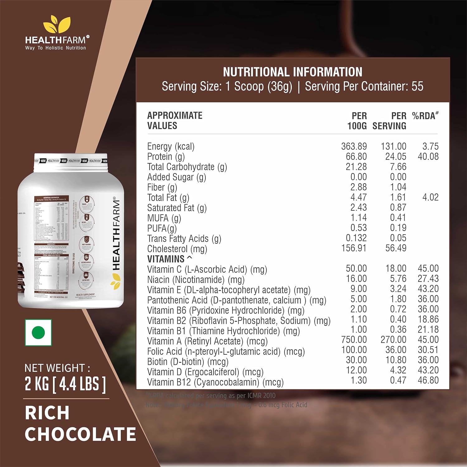 - QUALITY ASSURANCE : At Healthfarm, we prioritize quality. Our Whey Protein Plus undergoes rigorous testing to meet the highest industry standards, ensuring you get a product that you can trust for your health and fitness goals.