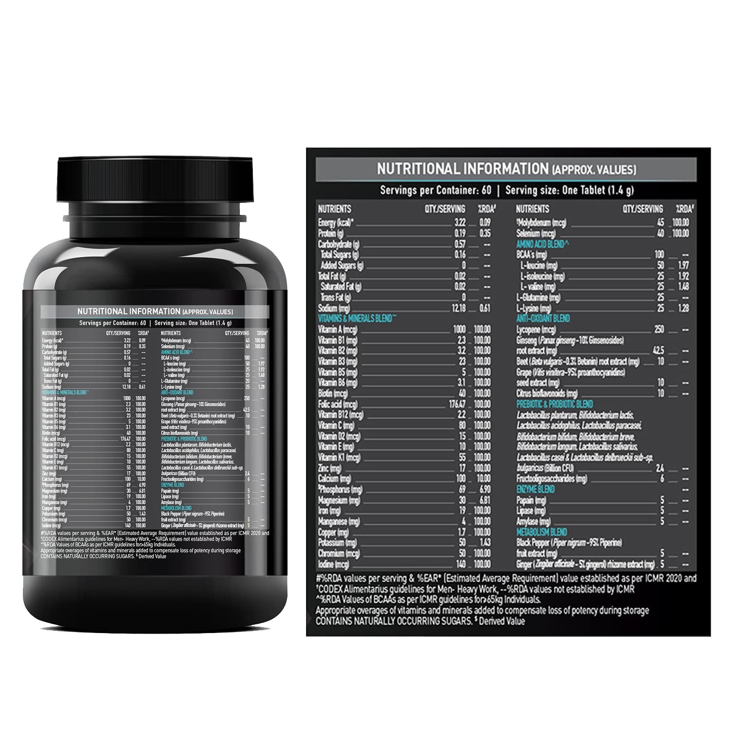 - EVERLASTING ENERGY & STAMINA: Elevate your fitness & stamina with each dose of a multivitamin tablet. Formulated with vitamins & minerals, amino acid, prebiotic & probiotic, enzyme, antioxidant and metabolism blend to maintain optimum energy levels